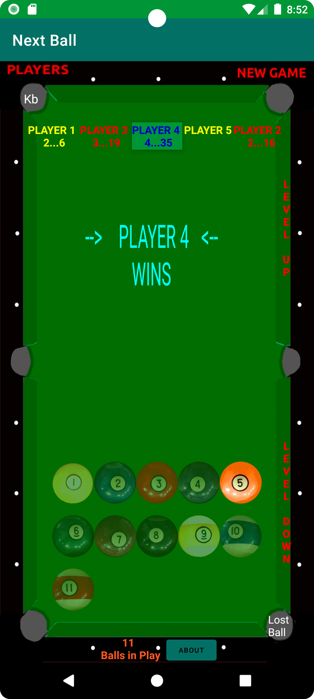 Turn Ends on a Miss: A players turn continues until they miss a shot. Once a miss occurs, the turn passes to the next player, and the cycle starts over with the app choosing a new ball.